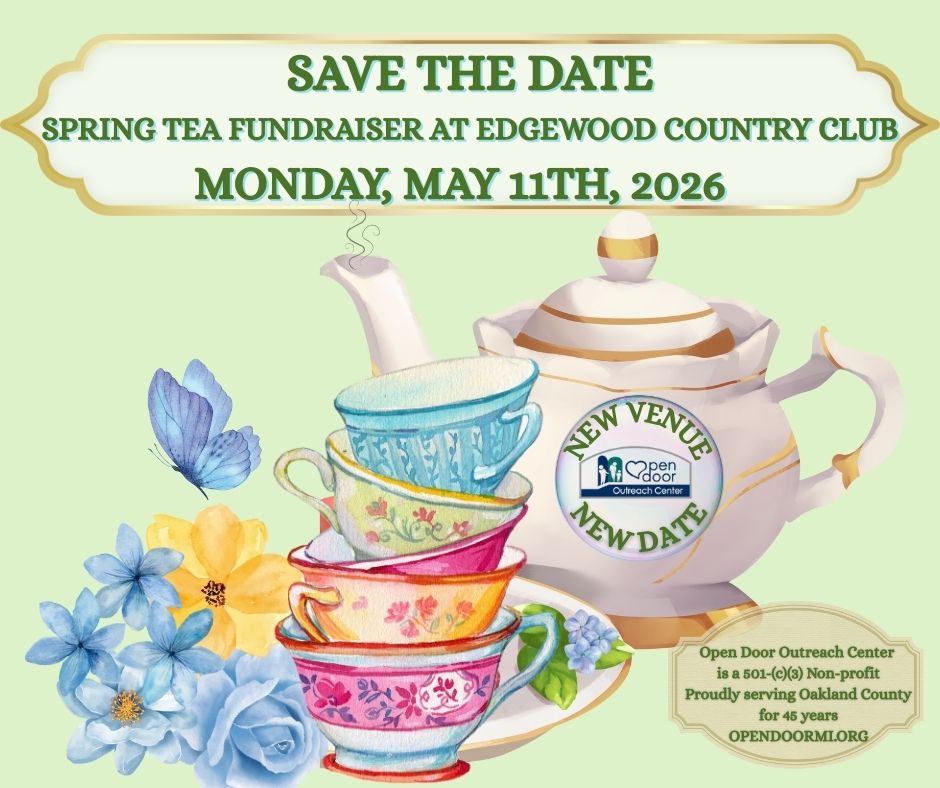 Join our Open Door Outreach Center on Monday May 11th 11-3pm for our Annual Spring Tea Luncheon Fundraiser at Edgewood Country Club! This popular event always sells out providing scratch made Tea Scones, delicious lunch, shop LOCAL vendor tables, 50/50 raffles, themed gift baskets, and much more!
